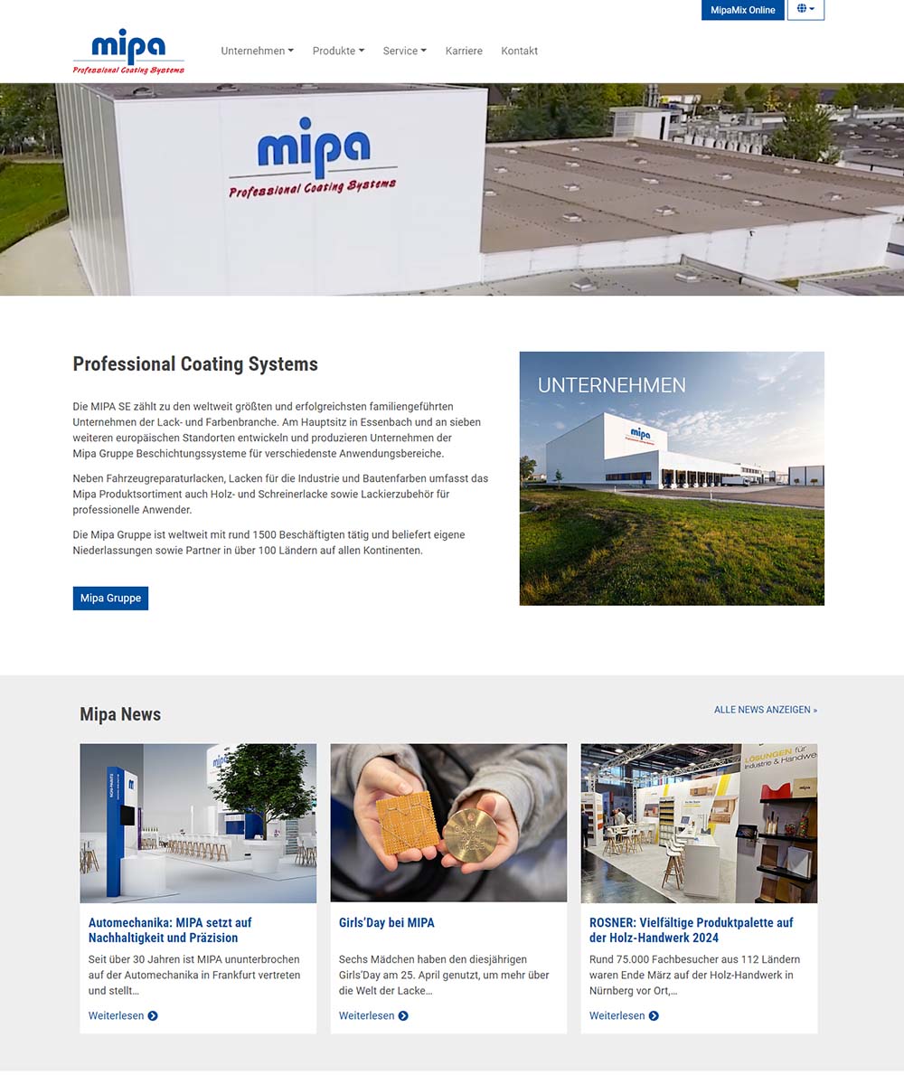 Die MIPA SE z?hlt zu den weltweit gr??ten und erfolgreichsten familiengeführten Unternehmen der Lack- und Farbenbranche. Am Hauptsitz in Essenbach und an sieben weiteren europ?ischen Standorten entwickeln und produzieren Unternehmen der Mipa Gruppe Beschichtungssysteme für verschiedenste Anwendungsbereiche.