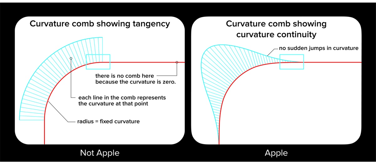 簡單來說,Apple 采用的圓角曲率所生成的圖形,是更圓滑,無明顯切角的。這樣的圓角矩形在過渡上更平滑,且在視覺上的體驗(yàn)也更融洽。