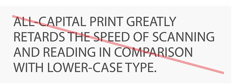不要所有文本使用大寫字母,強制用戶閱讀大寫字母,首字母大寫,具有特殊含義的縮寫等情況除外,與小寫字母相比,大量的使用大寫字母會嚴重降低用戶的閱讀效率和愉悅感。