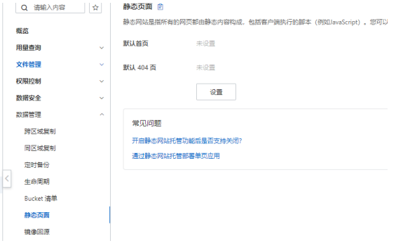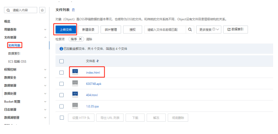 第一步:先將html文件上傳到對應的bucket里,如下圖所示,點擊“文件管理”->“文件列表”->“上傳文件”上傳名為index.html的文件,然后再進行其他的配置