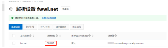 這里有個“自動添加CNAME記錄”的選項,其實很好理解,就是你的OSS存儲和域名是在同一個阿里云賬號的話,開啟后域名會自動添加一條解析記錄,如果不在同一個賬號下,就不要開啟了,添加后如下圖所示: